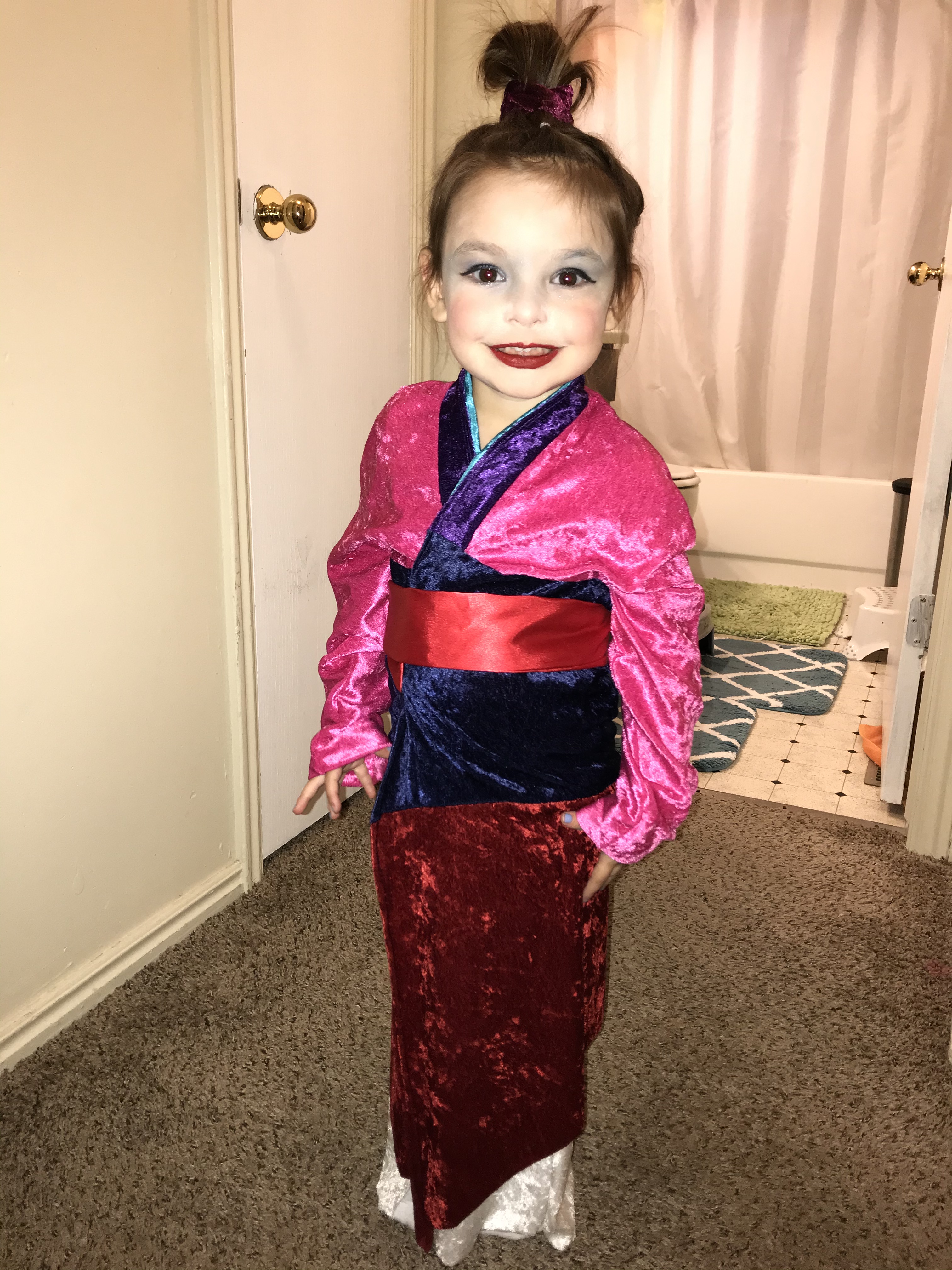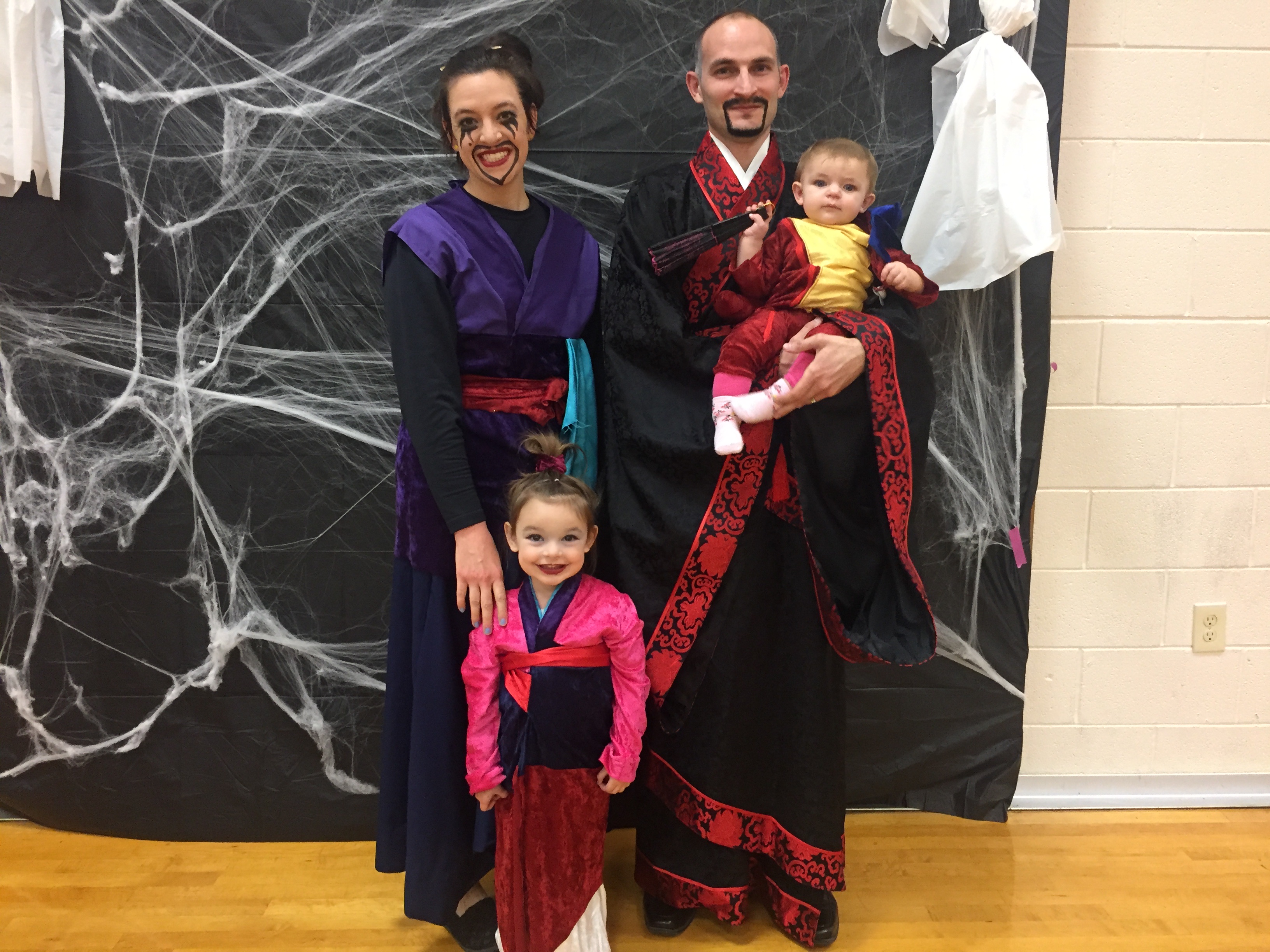 Here’s a photo of us in our Halloween costumes (that I made). Meeko as Mulan, Luna as Mushu, Billy as Fa Zhou, and me as the Matchmaker. These costumes have been overwhelming me for about two months. Between acquiring the material, doing things and having to force the kids to try them on periodically, being so tired from momming all day it was really difficult for me to enjoy these costumes when it came time to wear them and show off for our church friends. Nonetheless, here you go, Internet.